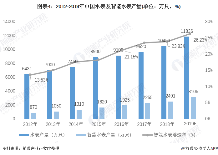在國(guó)家政策和技術(shù)的促進(jìn)下,及依托智能水表在智慧水務(wù)發(fā)展背景下的獨(dú)特的優(yōu)勢(shì),我國(guó)智能水表的滲透率和產(chǎn)量不斷增加。2012年我國(guó)水表產(chǎn)量為6431萬(wàn)只,智能水表產(chǎn)量?jī)H為870萬(wàn)只,智能水表的滲透率僅為13.53%,不足15%。據(jù)統(tǒng)計(jì),至2018年我國(guó)智能水表產(chǎn)量超過(guò)2400萬(wàn)只,市場(chǎng)滲透率達(dá)到23.83%,預(yù)計(jì)2019年我國(guó)智能水表產(chǎn)量超過(guò)3000萬(wàn)只,市場(chǎng)滲透率進(jìn)一步提升,將超過(guò)26%。