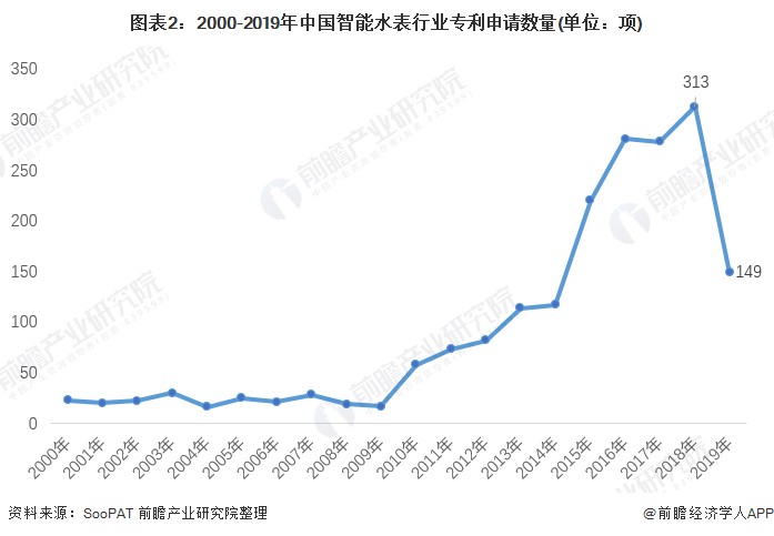 在國(guó)家政策的促進(jìn)下,智慧水務(wù)的發(fā)展對(duì)智慧水表的需求也不斷提升,促進(jìn)了企業(yè)對(duì)相關(guān)技術(shù)的重視, SooPAT公布數(shù)據(jù)顯示,2000-2018年我國(guó)智能水表的專利申請(qǐng)數(shù)波動(dòng)增加,2018年共申請(qǐng)專利313項(xiàng),2019年智能水表技術(shù)發(fā)展進(jìn)入穩(wěn)定沉淀期,天津水處理設(shè)備專利申請(qǐng)數(shù)有所下降,為149項(xiàng)。